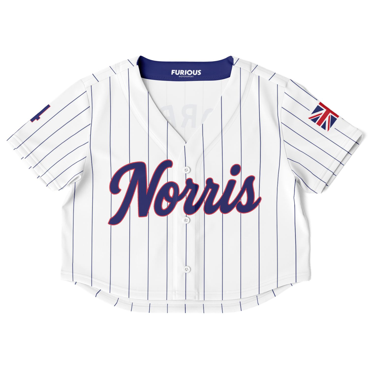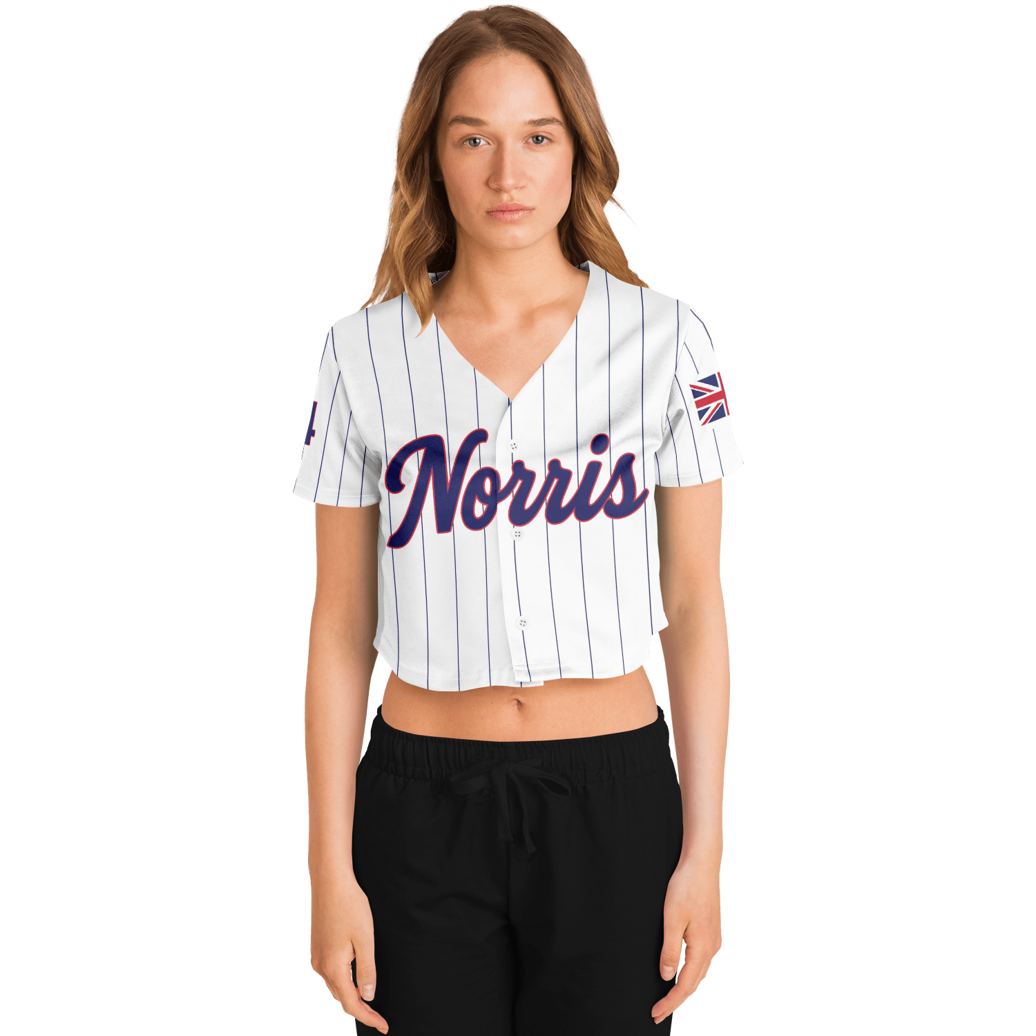 The Norris – Britannia Crop Top brings classic style and bold energy into a modern silhouette. With its crisp white base and thin blue pinstripes, this cropped design features “Norris” across the chest and the number “4” for a clean, iconic finish.
