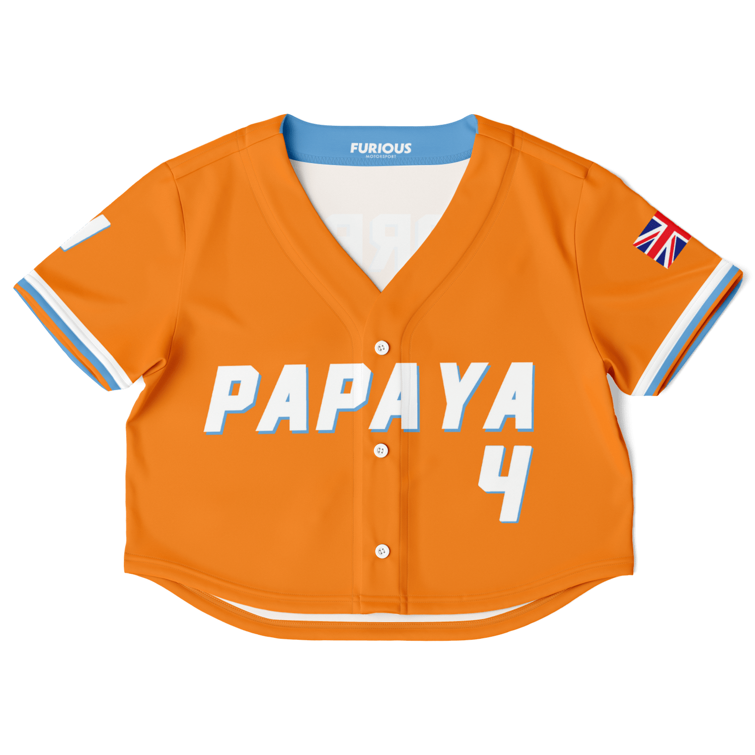 The Norris – Papaya Alternate Crop Top brings bold personality and fresh energy to a modern fit. With its signature papaya base accented by crisp sky-blue and white details, this design highlights “Papaya” across the chest and the number “4” for a vibrant, standout look.