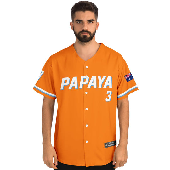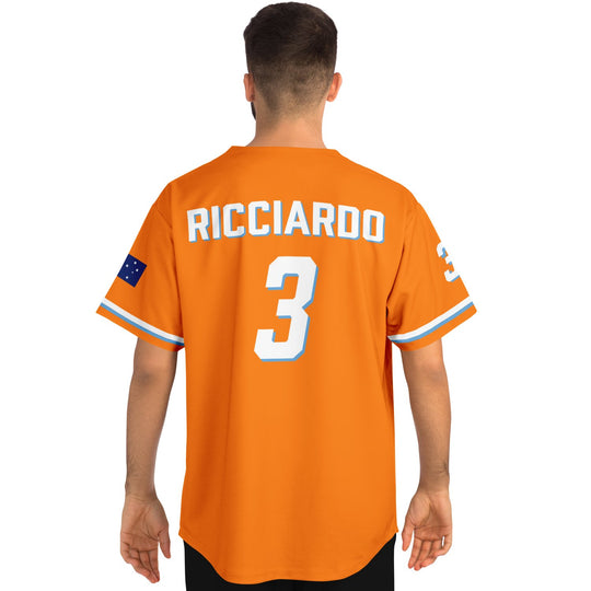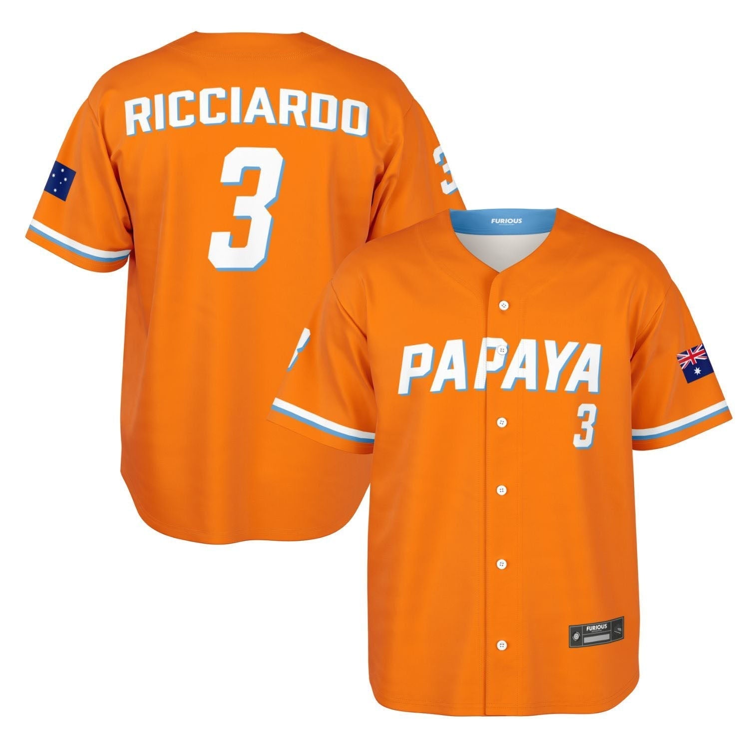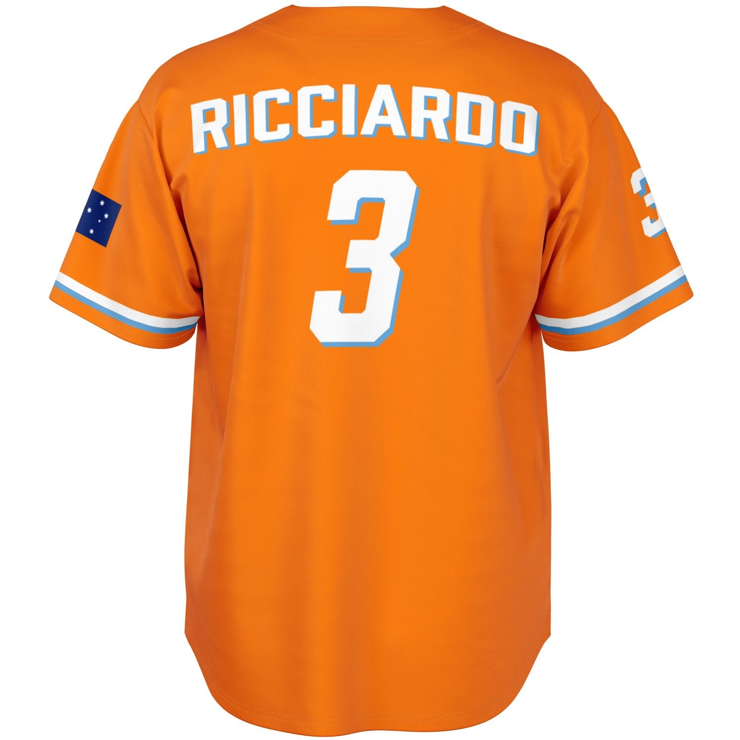 Ricciardo papaya alternate jersey. Features an orange color base with blue accents, driver number/home country flag on the sleeves, and Ricciardo #3 on the back.