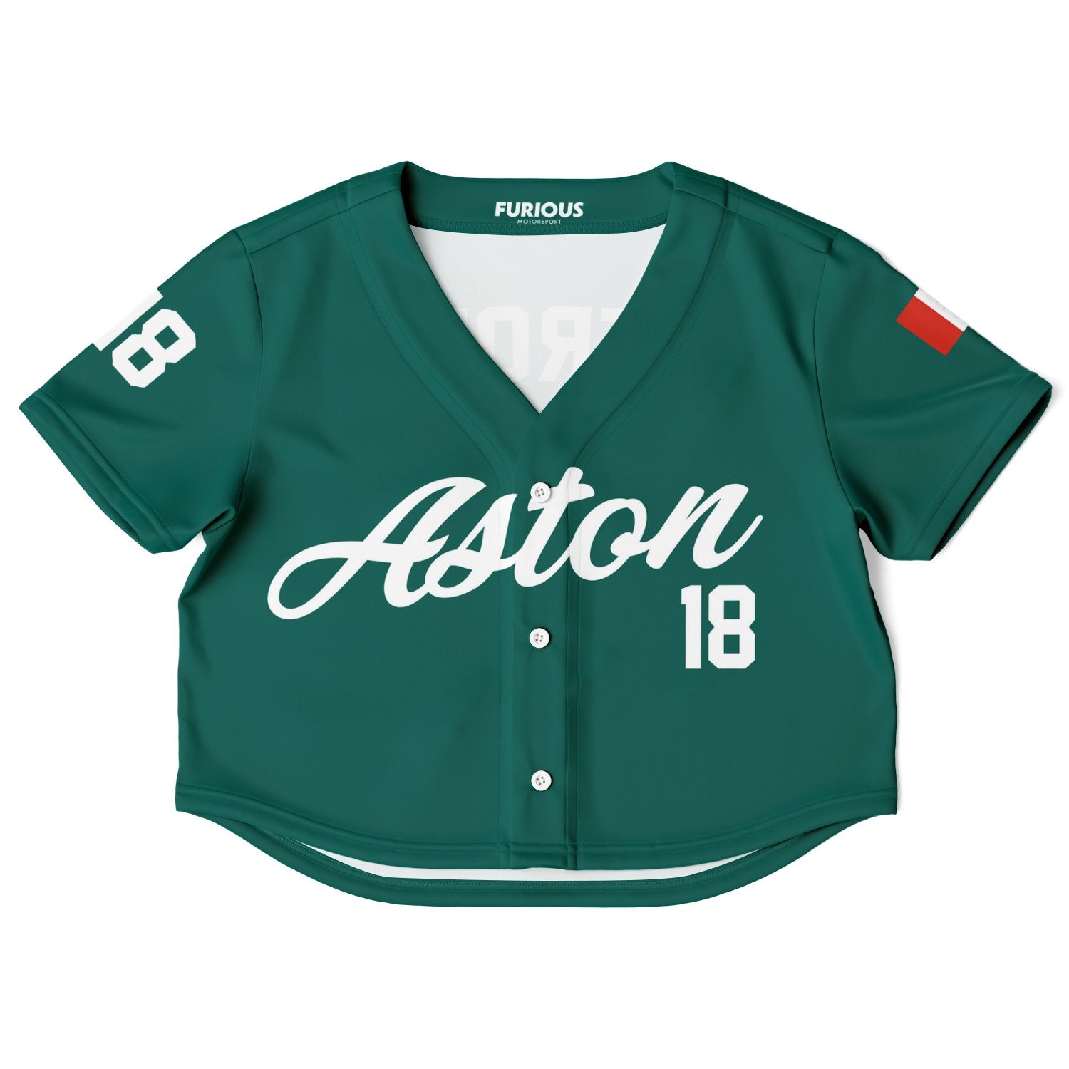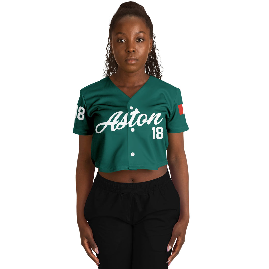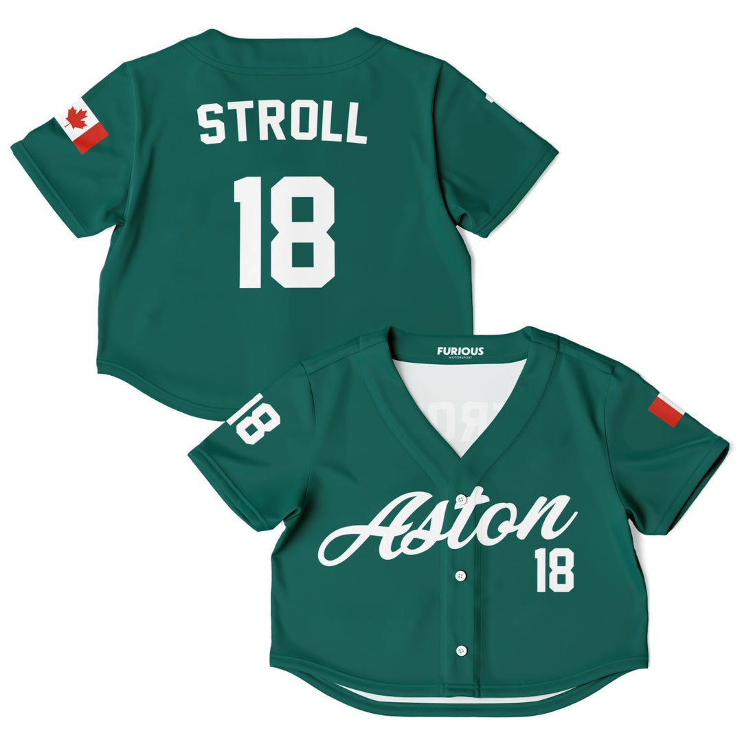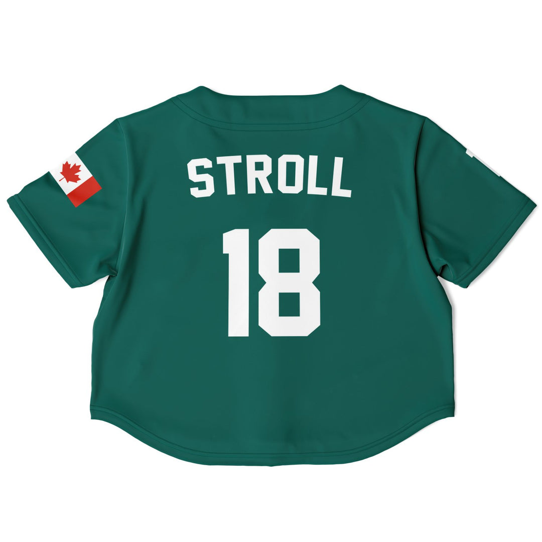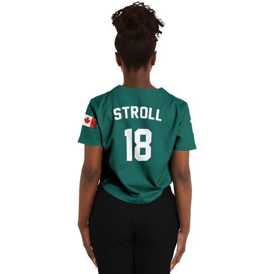 Stroll away crop top jersey. Features a forest green color base, driver number/home country flag on the sleeves and Stroll #18 on the back.