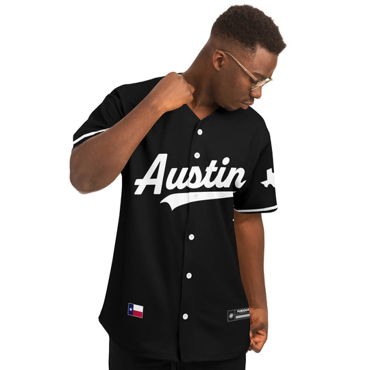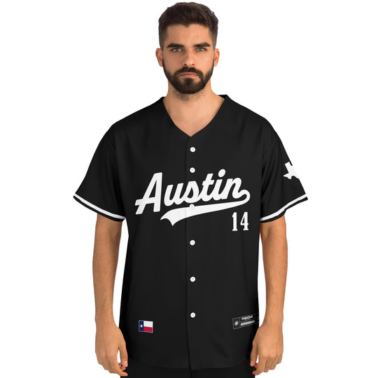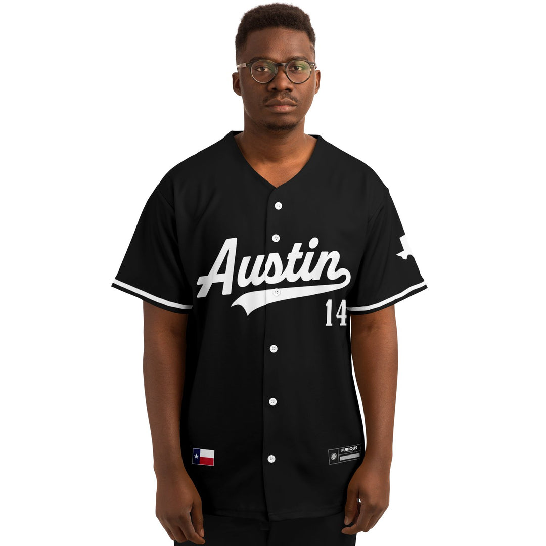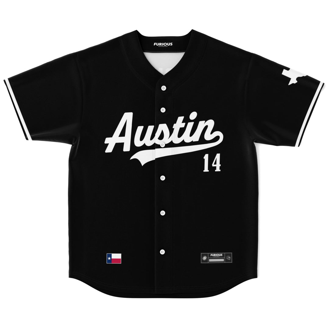 Introducing the Jet Black Austin jersey. This jersey is inspired by vintage athletic designs with a clean all-black minimal feel. It featured a bold "Austin" across the chest plus the driver's name and number in vintage racing fonts. Don't miss the hidden Texas flag and state outline on the front and sleeves.