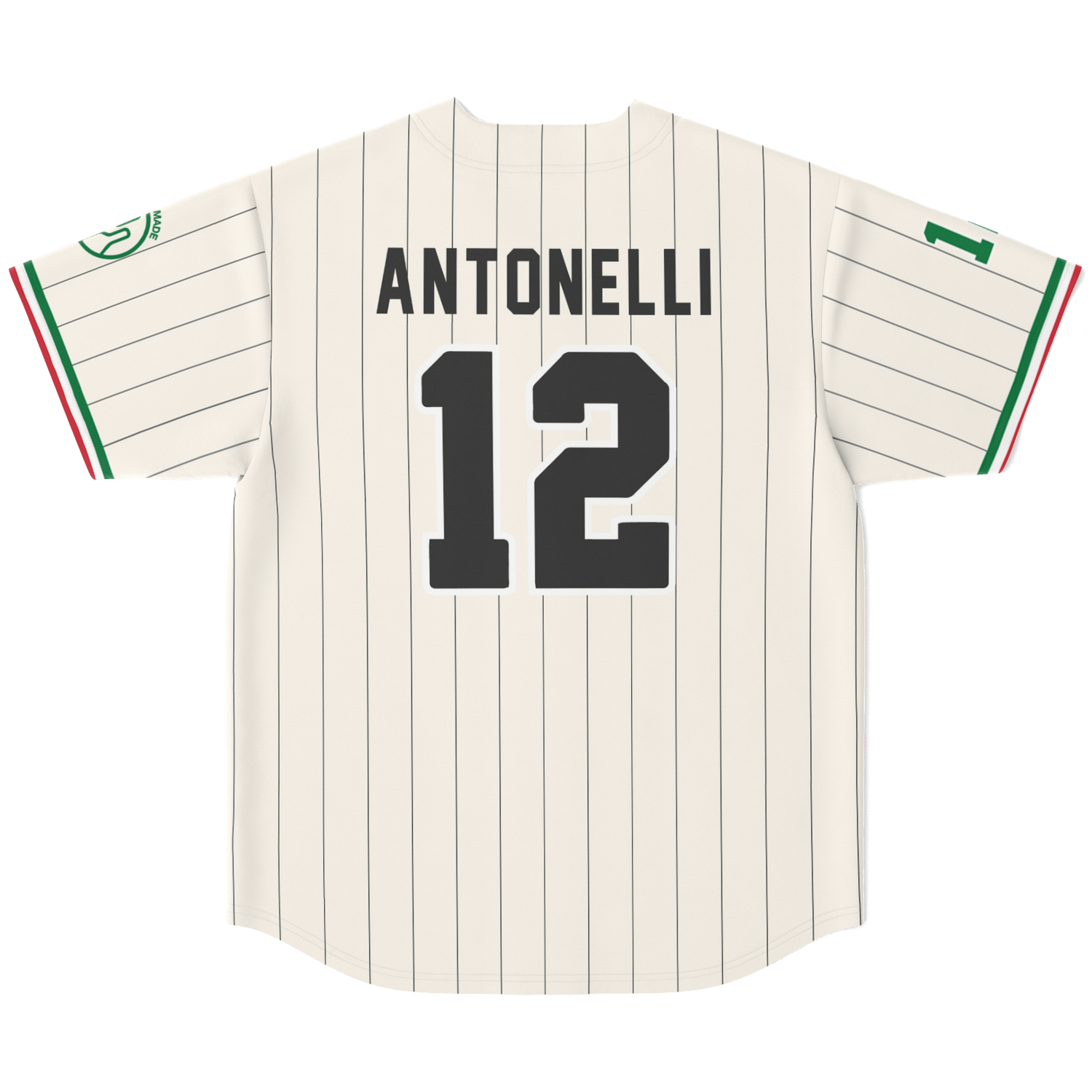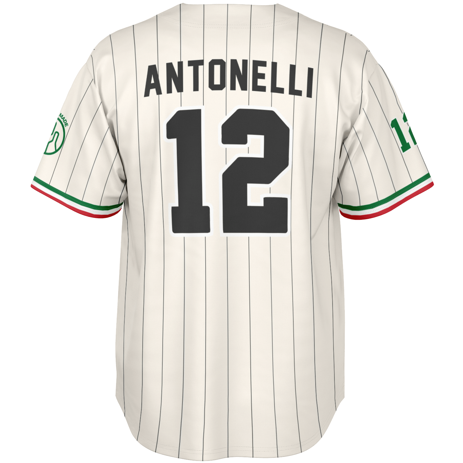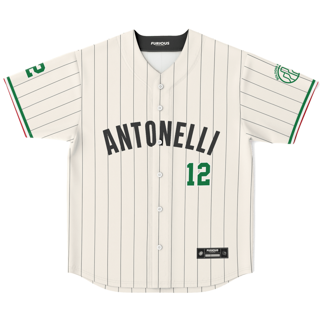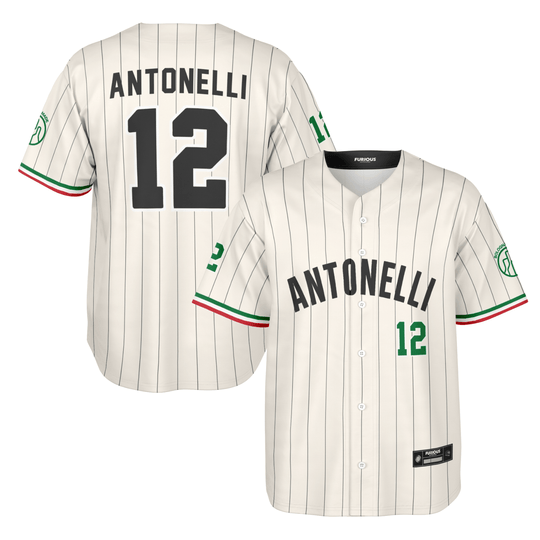 Introducing the Antonelli – Home Jersey, a timeless piece that captures vintage charm with a modern edge. Featuring a crisp cream base with thin black pinstripes, this design brings classic baseball aesthetics into the fast-paced world of motorsport. The bold "ANTONELLI" lettering across the chest and signature number "12" in green create a clean, standout look rooted in racing pride.