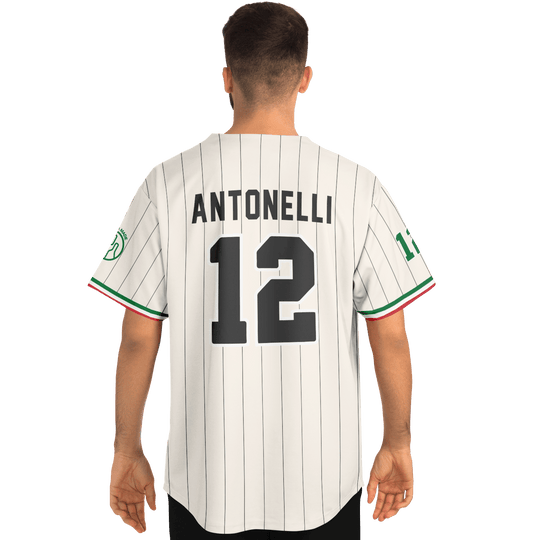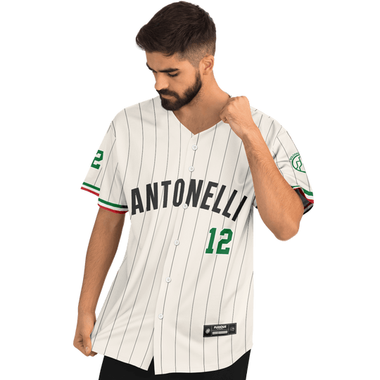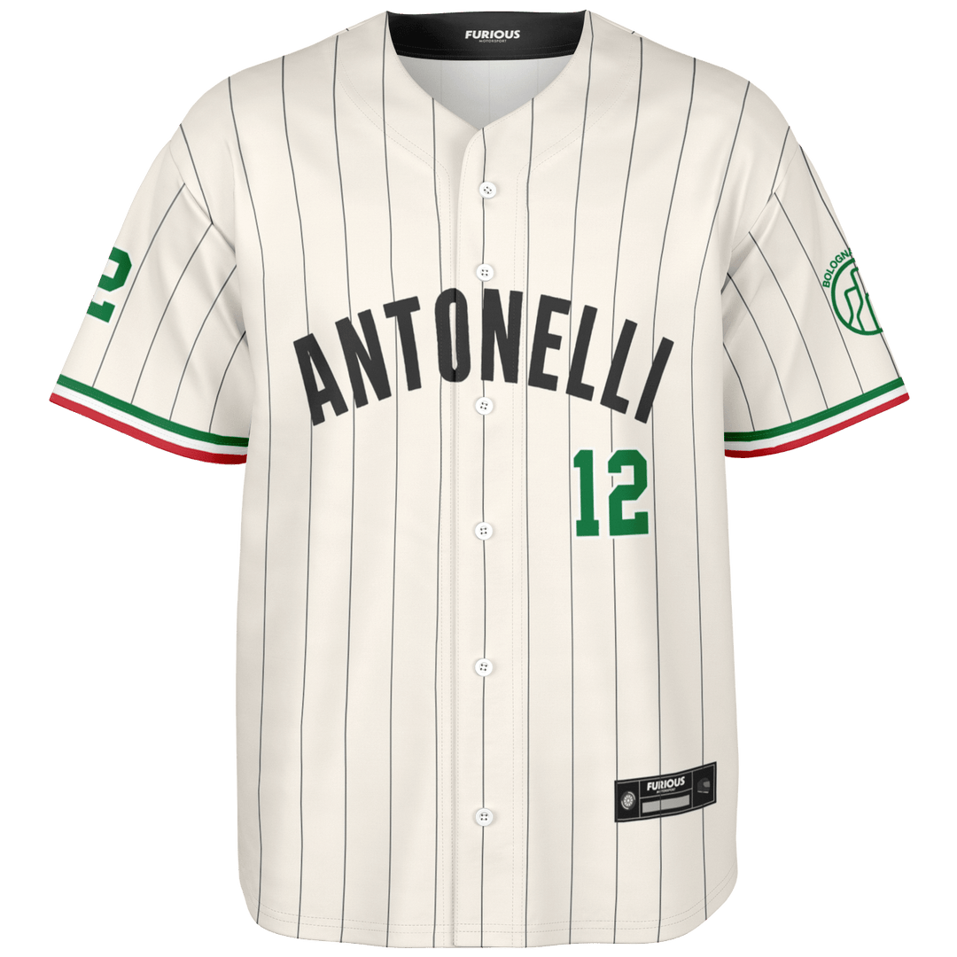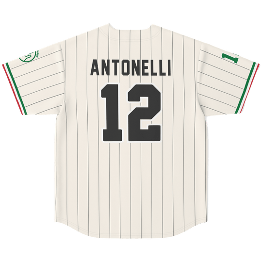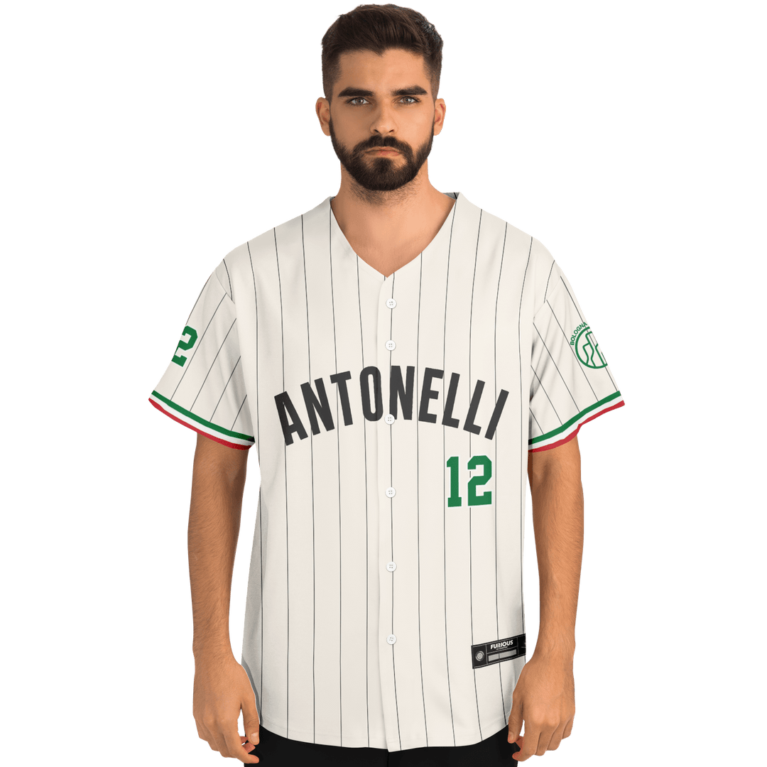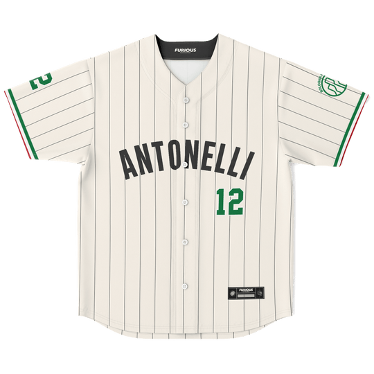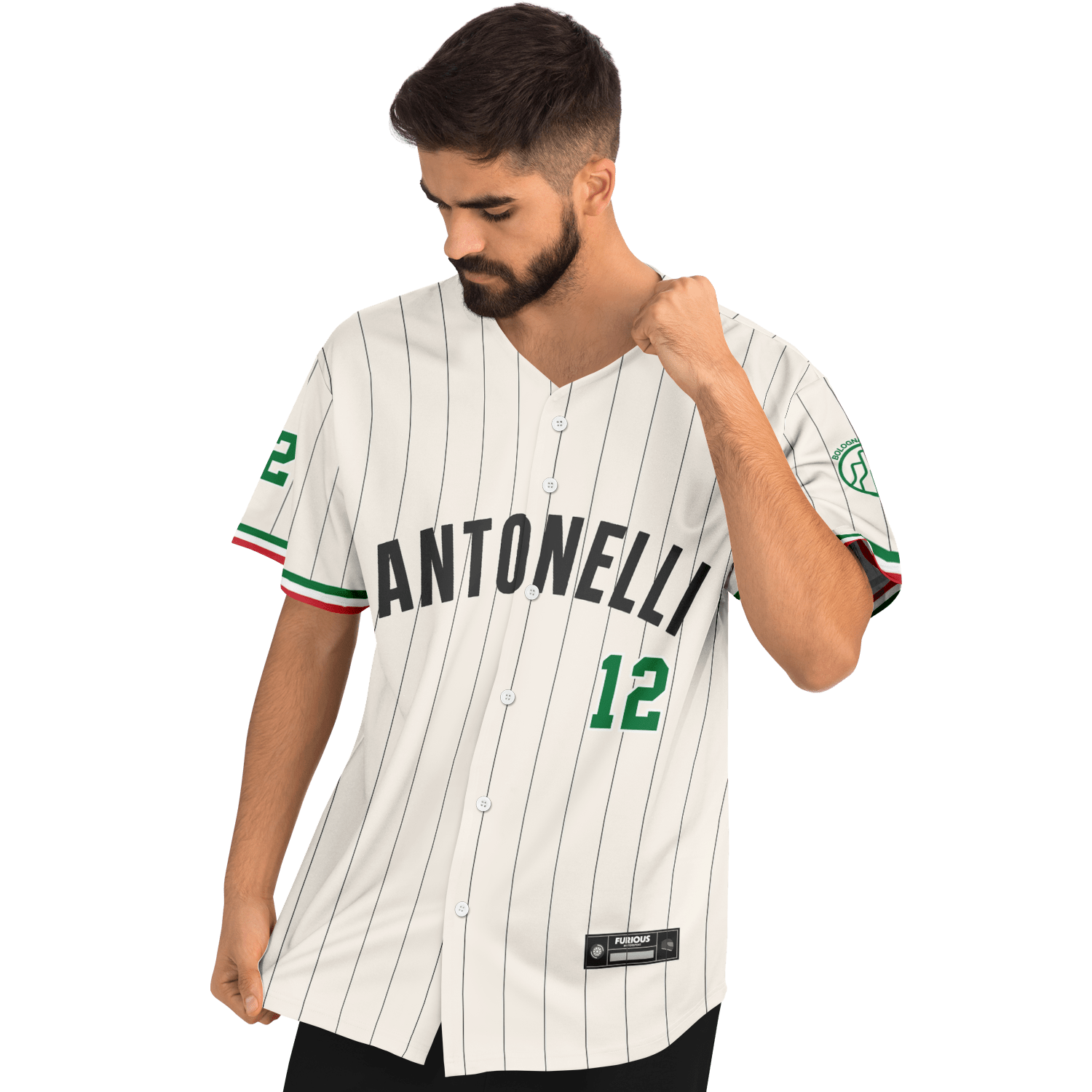 Introducing the Antonelli – Home Jersey, a timeless piece that captures vintage charm with a modern edge. Featuring a crisp cream base with thin black pinstripes, this design brings classic baseball aesthetics into the fast-paced world of motorsport. The bold "ANTONELLI" lettering across the chest and signature number "12" in green create a clean, standout look rooted in racing pride.