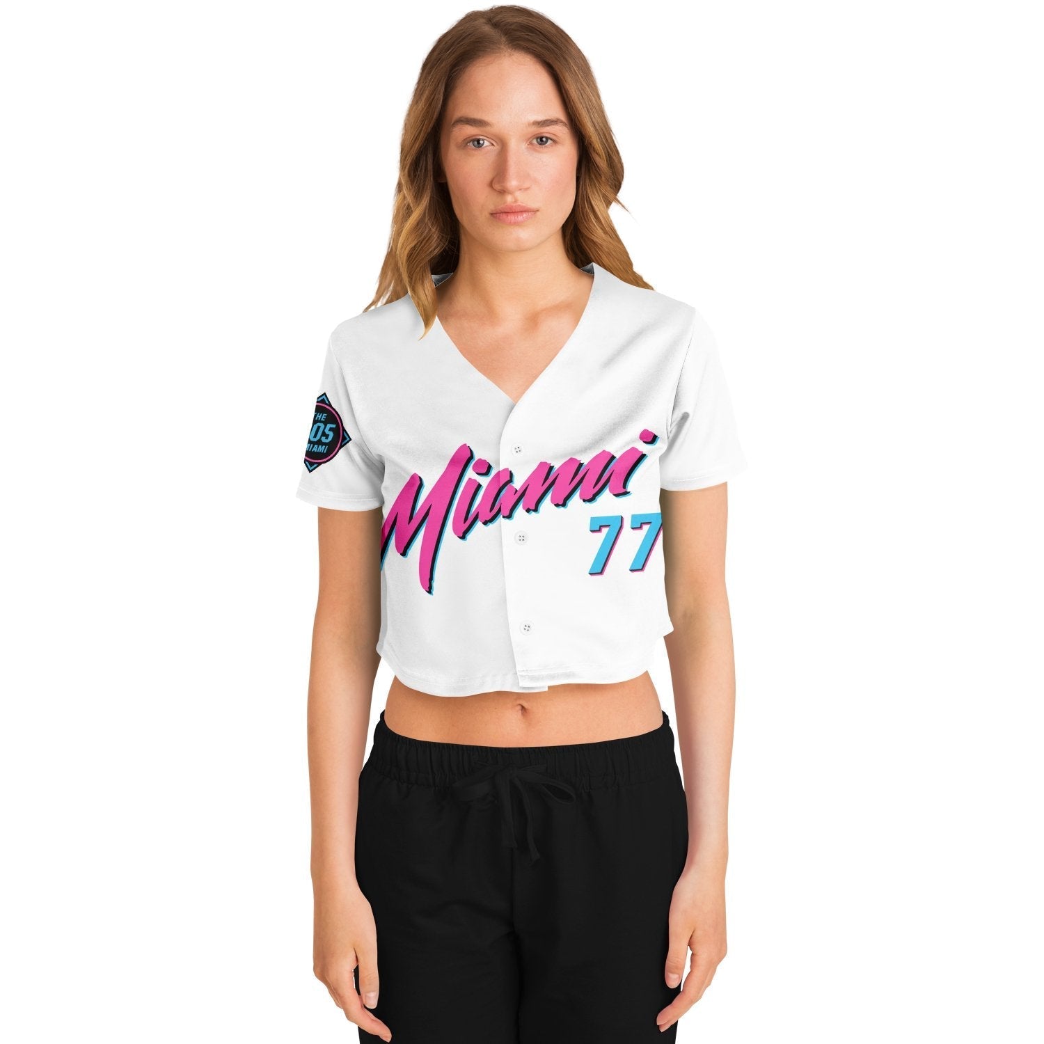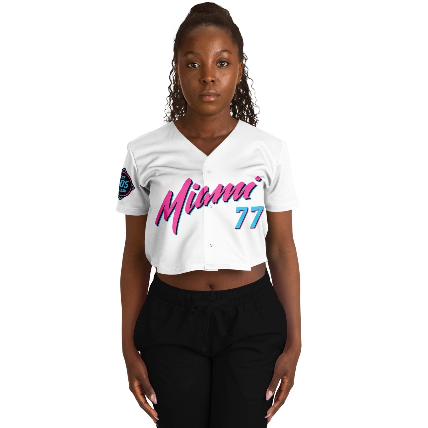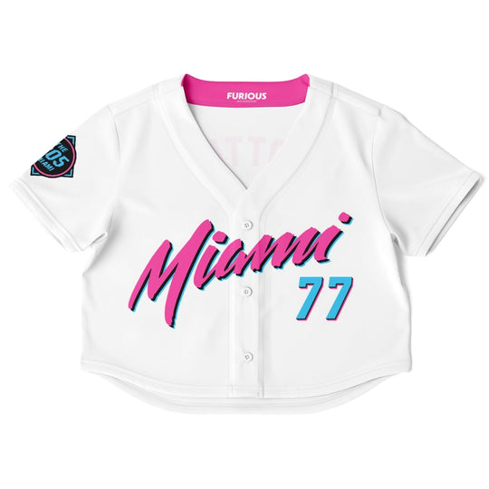 Introducing the Miami Vice City Home Crop Top, a tribute to the vibrant energy of the 305. Crafted with a pristine white base, this crop top boasts striking accents of hot pink, sky blue, and black along the edges of its sleeves, adding a pop of color to your racing ensemble. With the iconic "Miami" emblazoned across the front and the distinctive 305 emblem proudly displayed on the right sleeve, this crop top captures the essence of Miami's dynamic culture.