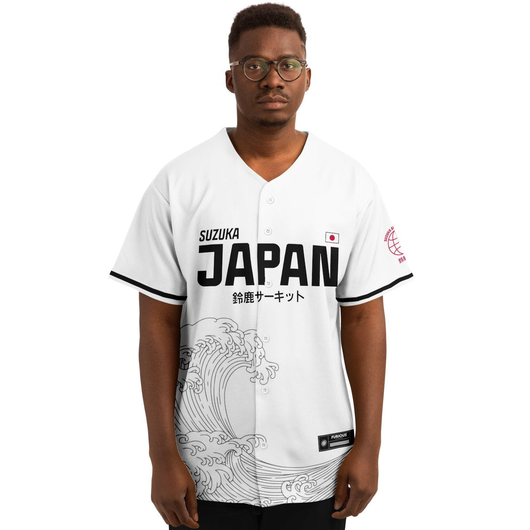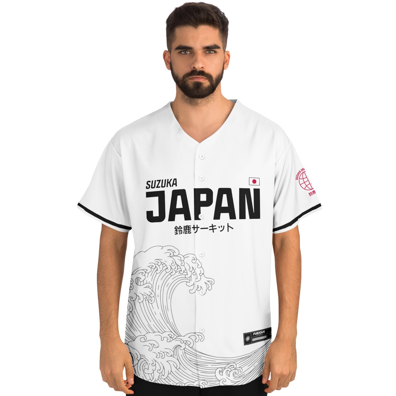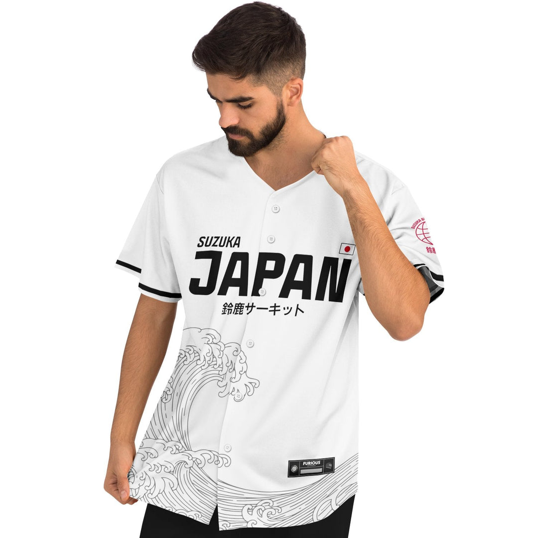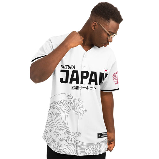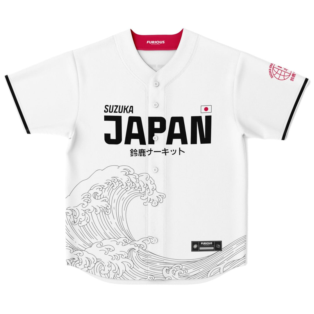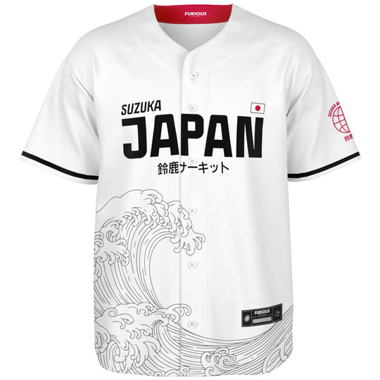 Introducing the Suzuka "Great Wave" jersey. Inspired by vintage motorsport racing of the 1980s and the iconic "The Great Wave off Kanagawa", painted by Japanese artist Katsushika Hokusai in the late 1830s. This Suzuka jersey symbolizes the speed, power, and history of Japan and its racing heritage.