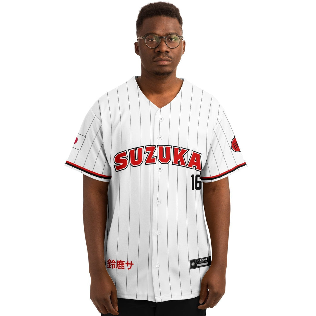 Meet the Suzuka City Jersey. Inspired by the rich history of Japanese baseball. This Suzuka City Jersey includes strong influence from the Japanese National Team. It features a big, bold "Suzuka", referencing the vibrant city of the Mie Prefecture, and includes bright red accents inspired by the “Rising Sun” of the Japanese flag.