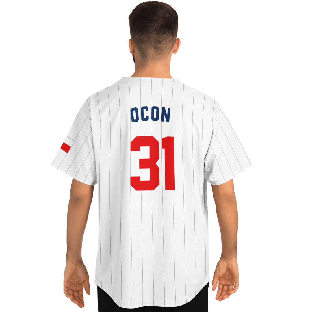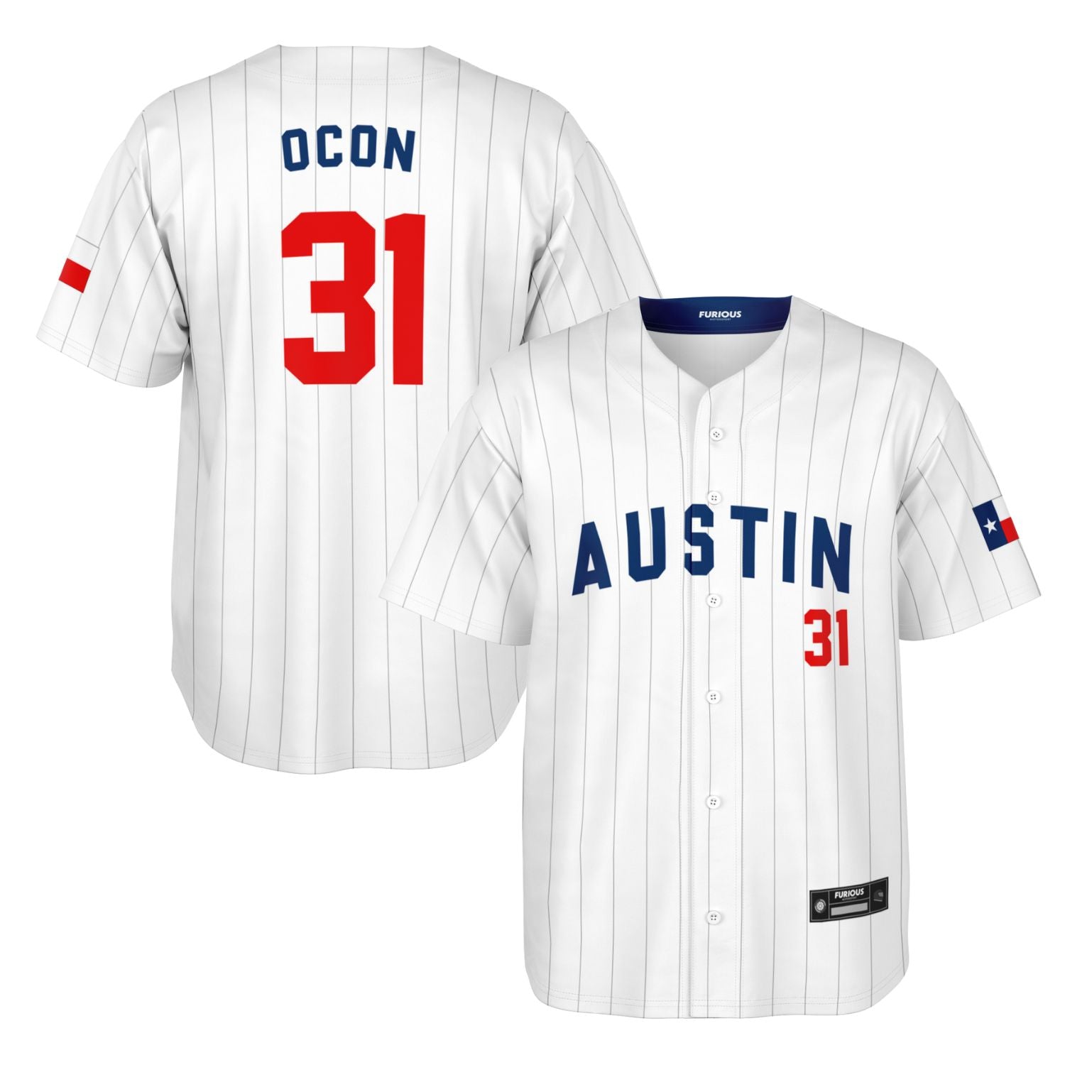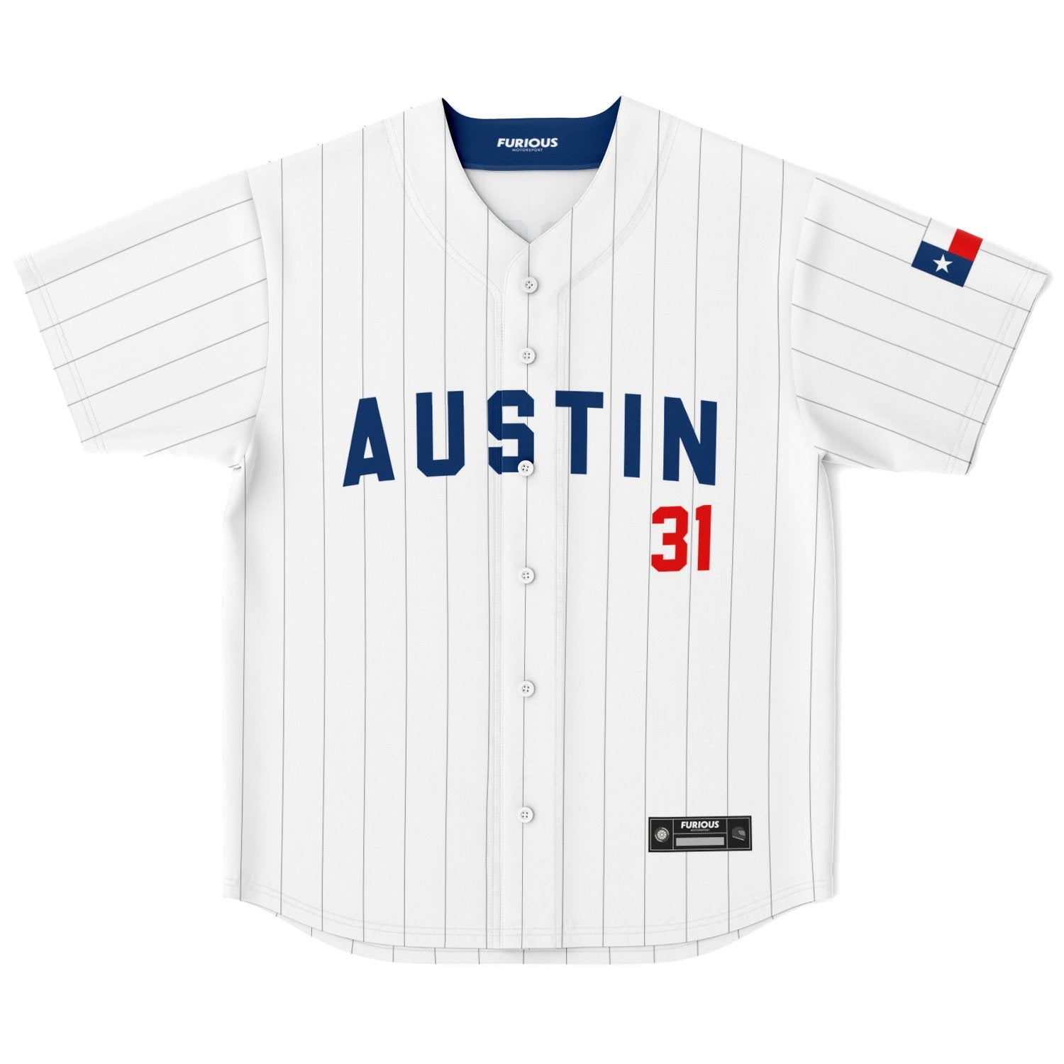 This Lone Star jersey is inspired by the capital of the great state of Texas and its iconic red white and blue flag. Featuring a clean white pinstripe aesthetic, the jersey includes a large "Austin" in blue and a minimalistic driver name and number in red.