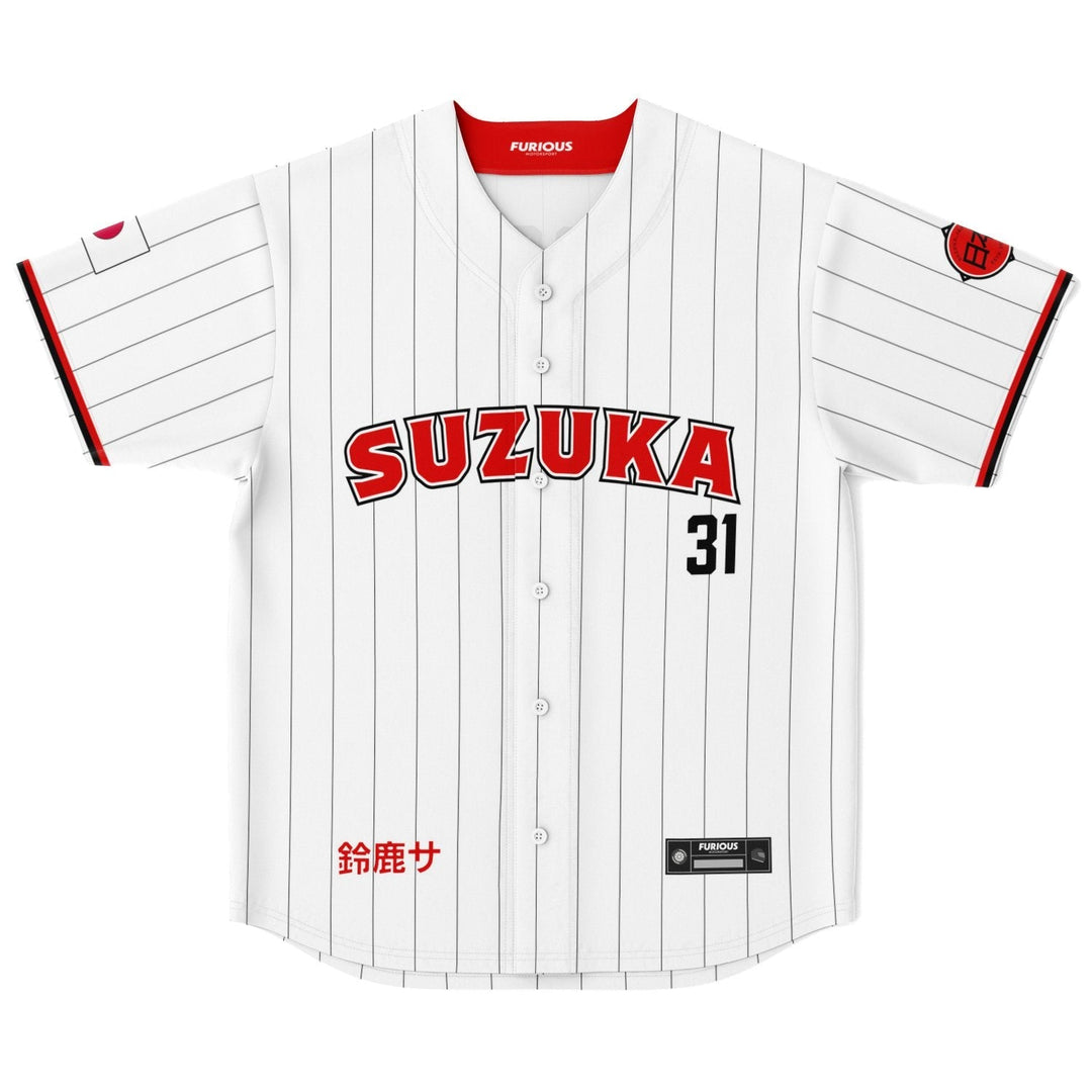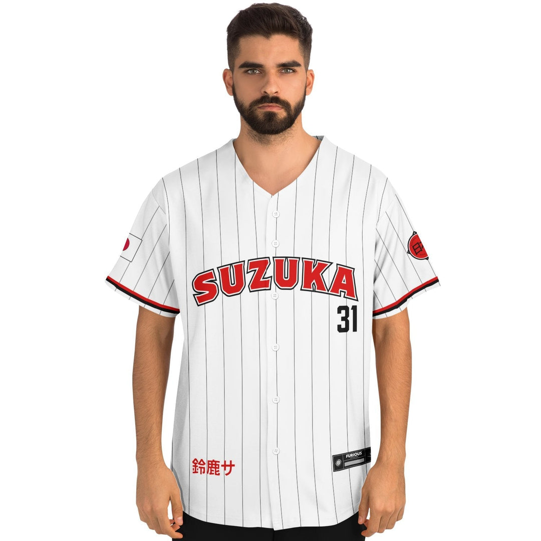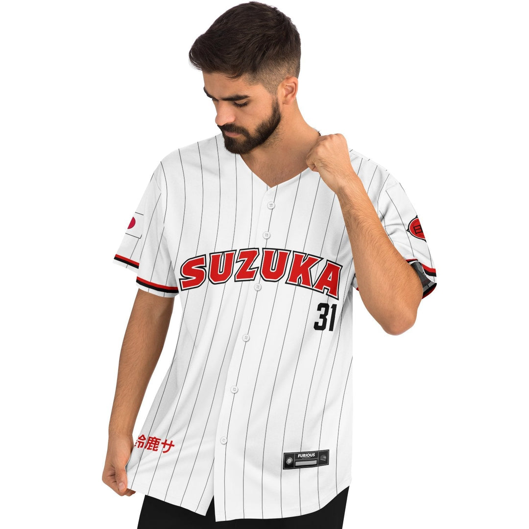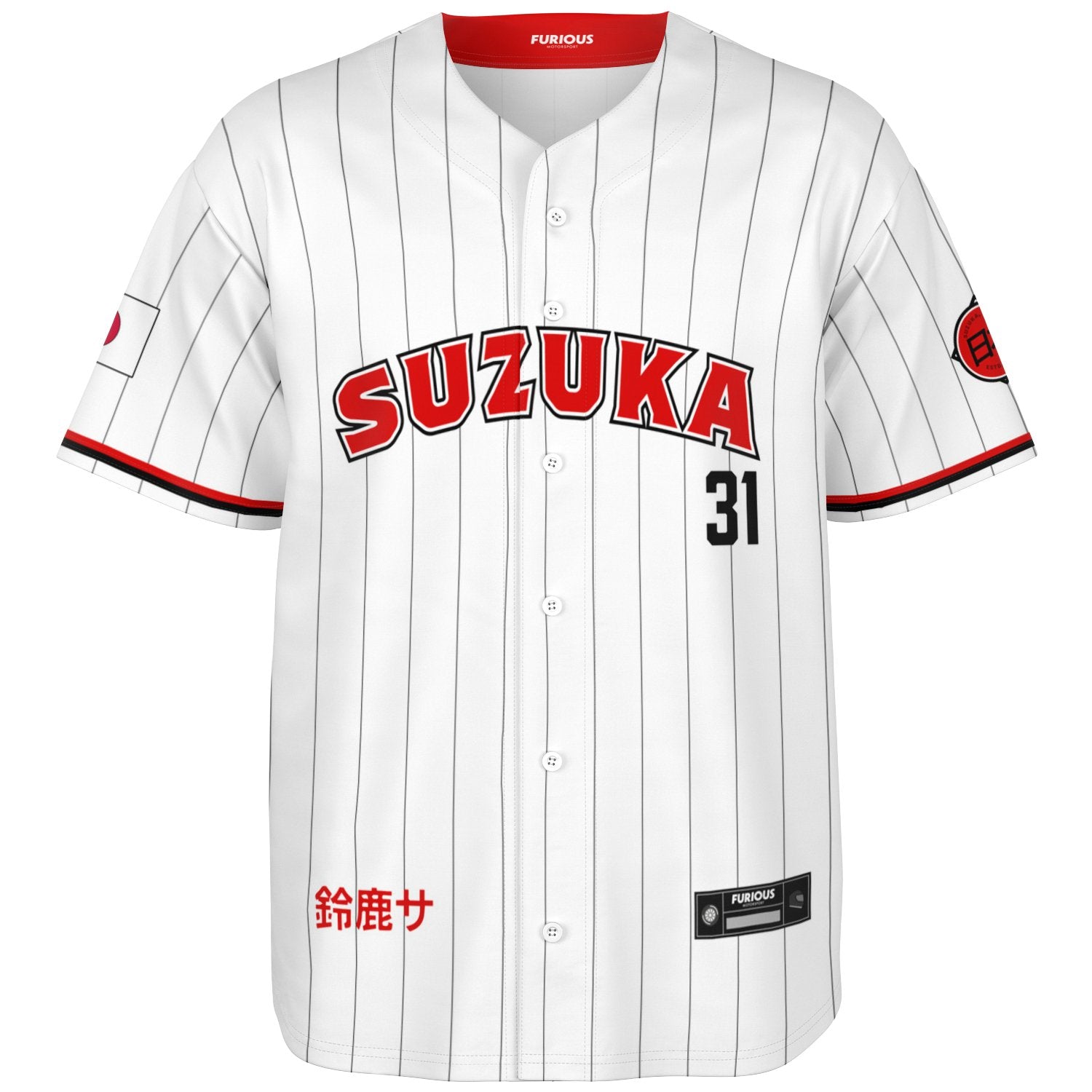 Meet the Suzuka City Jersey. Inspired by the rich history of Japanese baseball. This Suzuka City Jersey includes strong influence from the Japanese National Team. It features a big, bold "Suzuka", referencing the vibrant city of the Mie Prefecture, and includes bright red accents inspired by the “Rising Sun” of the Japanese flag.