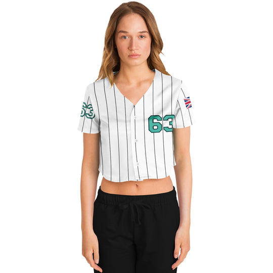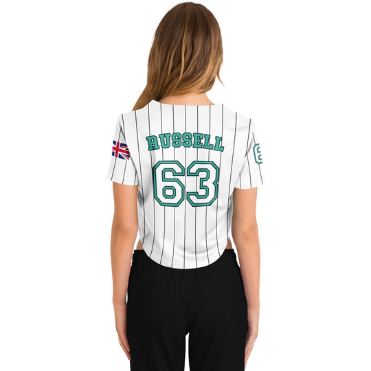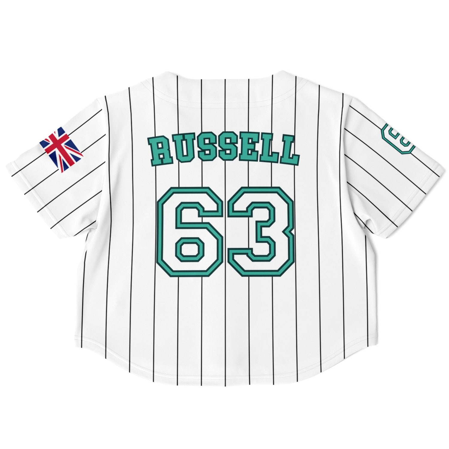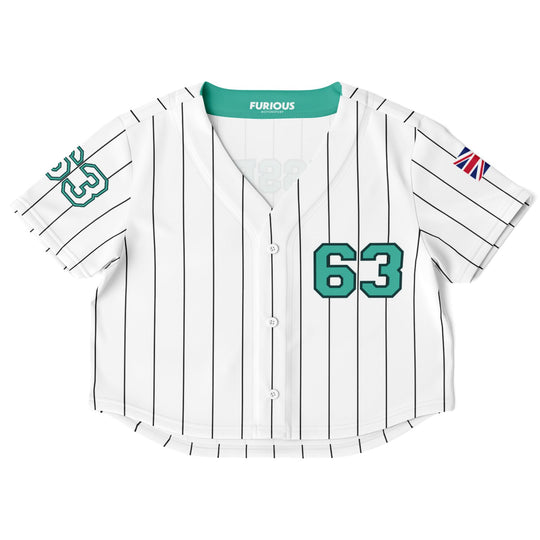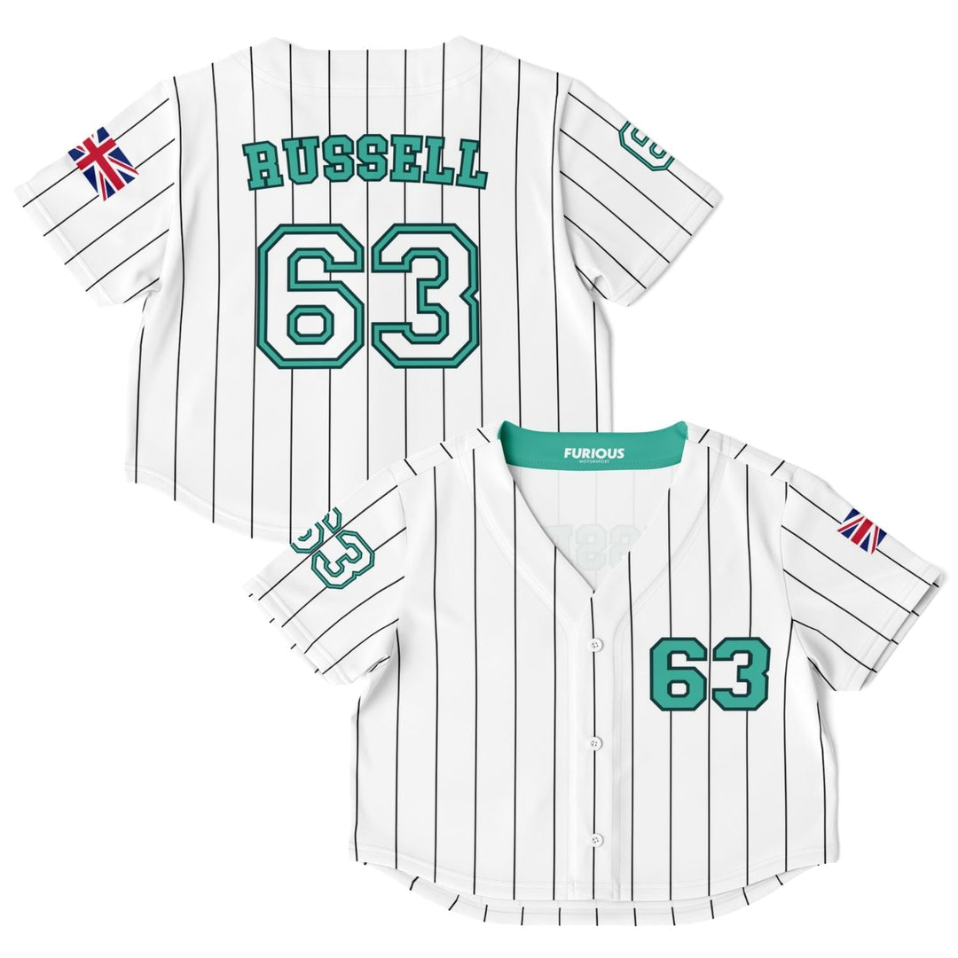 Russell home crop top jersey. Features a white color base with black pinstripes, green accents, driver number/home country flag on the sleeves, and Russell #63 on the back.