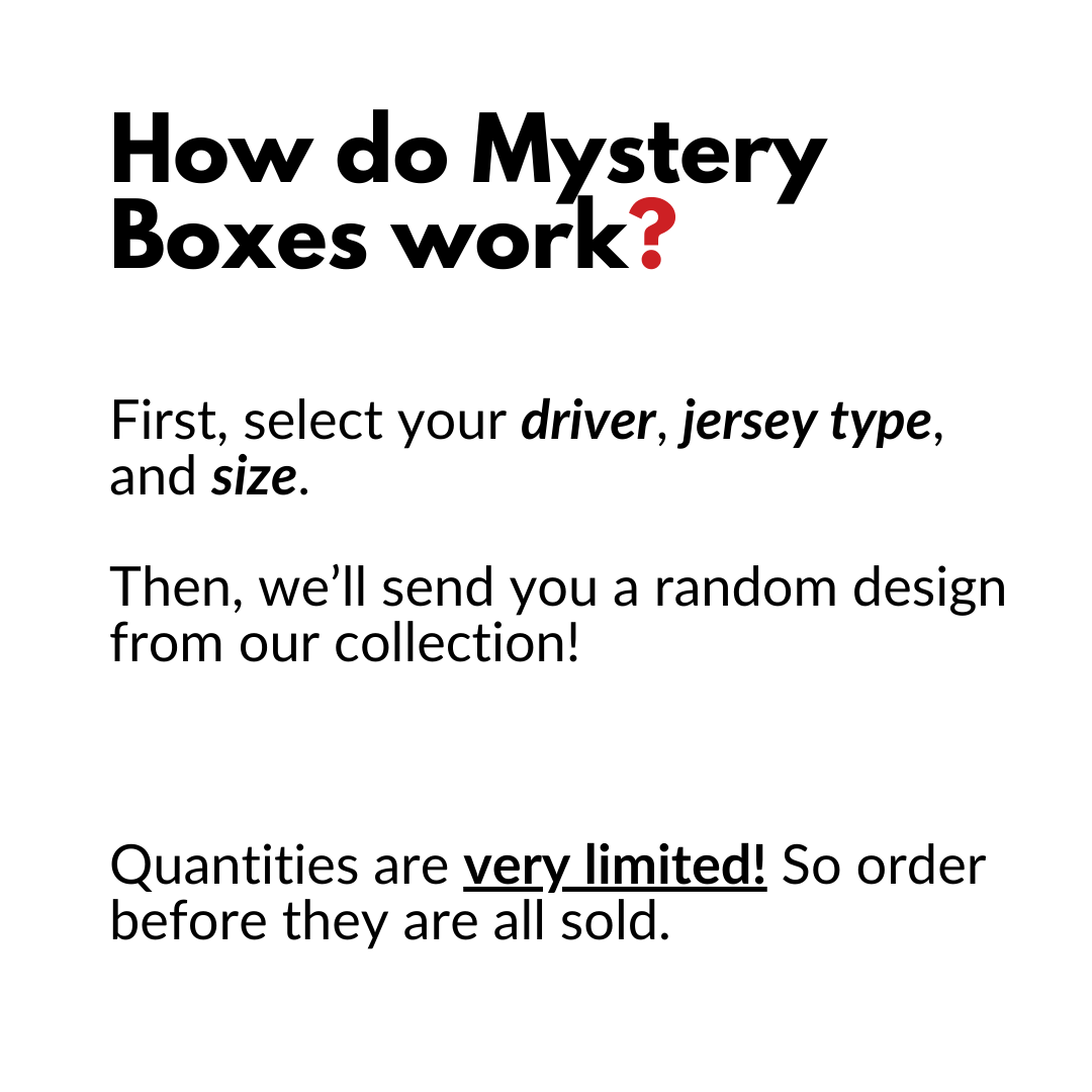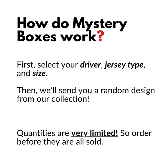 Select your driver, jersey type, and size. Then, we’ll send you a random design from our collection! Quantities are very limited! So order before they are all sold.